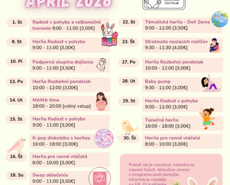 Rodinné centrum Macko pripravilo aj v marci 2026 pestrý program pre rodiny s deťmi všetkých vekových kategórií. Čakajú vás obľúbené herničky, tematické stretnutia, pohybové aktivity, podporné skupiny pre …