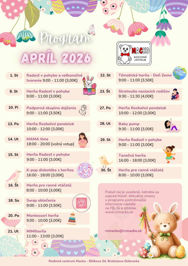 Pre aktuálne informácie a prípadne zmeny v programe sledujte náš web, FB, IG alebo sa opýtajte našich dobrovoľníčok. Ďakujeme